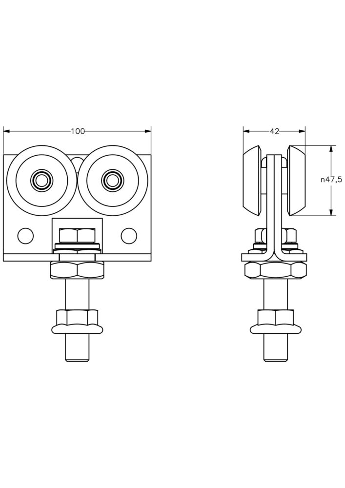 Dessa hängrullar används huvudsakligen till olika typer av vikdörrar. Hängrullen är kort och avsedd för icke frekventa dörrar. I området under skenan ligger ett axiallager som skjuts in i en slits på hängrullens ena sida. Lagret låses med en fingängad mutter och kan följaktligen finjusteras i belastat läge. Höjdjusteringen görs genom ett gängat hål i dörren.